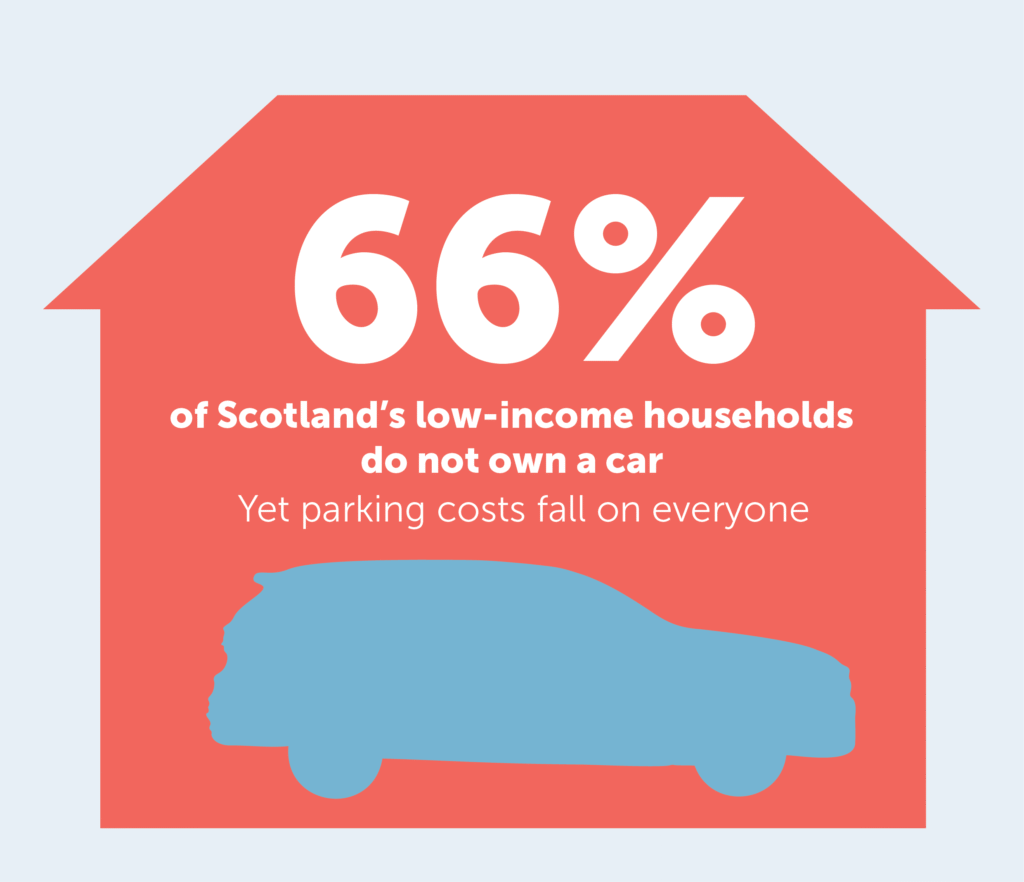 In addition to its impacts on road damage, public health, climate, and safety, parking policy is a key fairness issue – and raises questions of how we use limited street space. In Scotland, 1 in 4 have no access to a car (rising to 66% for low-income households), yet large areas of valuable urban space are still set aside for parking.